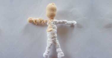Para los brazos, corte una tira de algodón 5 x 6,5 cm (2 x 2 5/8 in) de punto. Doblar los bordes hacia el centro, luego doble la tira todo por la mitad otra vez para hacer un rollo delgado. Viento el rodillo transversal con hilo fuerte, dejando 0,5 cm (1/4 pulg) en cada extremo para las manos. Cubrir las manos con piel-coloreado del knit del algodón.