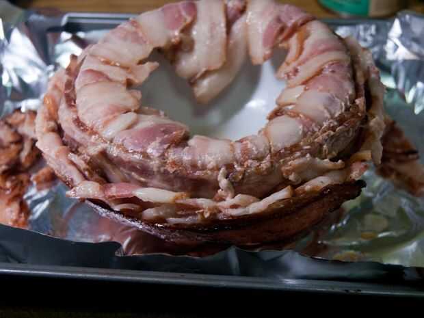Levantar el tazón de fuente y el lado derecho del tocino. Tenga cuidado al hacerlo. Las capas de bacon no están firmemente asentadas juntos por lo que pueden sentirse sueltas. Los pedacitos de tocino escondido debajo de la taza al principio ahora deben ser visibles. Ahora es el momento para cuidar de los extremos rizado tocino del último paso. Corte cualquier exceso bits de los extremos del tocino del último paso (deje los extremos escondidos debajo de la taza sola). Luego tomar el escondido en los extremos y envolver en el tocino en el borde del bolw. Use palillos de dientes para sostenerlos en lugar.