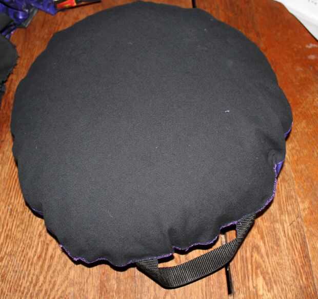Voltear la tela lado derecho hacia fuera y empezar a rellenar el cojín en la tapa. Coloqué el cojín para que el mango Unido fue sacar por la abertura de la tapa.