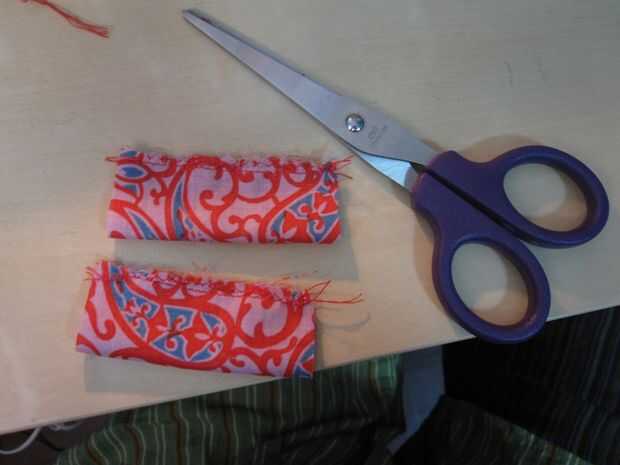 -Corte dos pedazos de cinco centímetros de ancho, ocho centímetros de largo, doblarlas por la mitad y coser un lado.