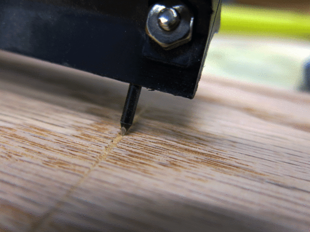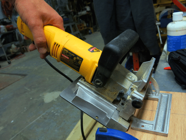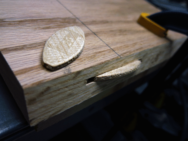 Mi roble tablones de madera son lo suficientemente densas como para que puedo usar la galleta estándar más grande, un #20. Una vez que ya es hora de cola para arriba probablemente pondré cinta de pintor en la superficie exterior para coger cualquier pegamento que se exprime a través.