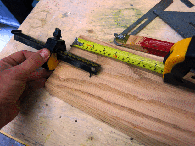 Para asegurarse de que las ranuras alinean he utilizado a un escribano y marcó una línea en cada pedazo, de tres pulgadas desde ambos extremos.