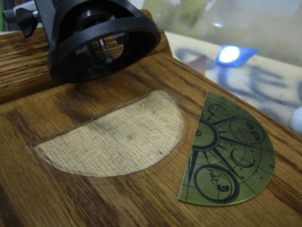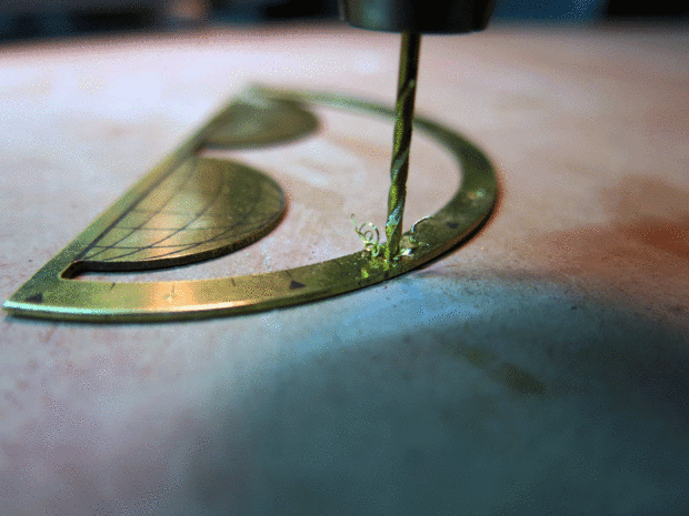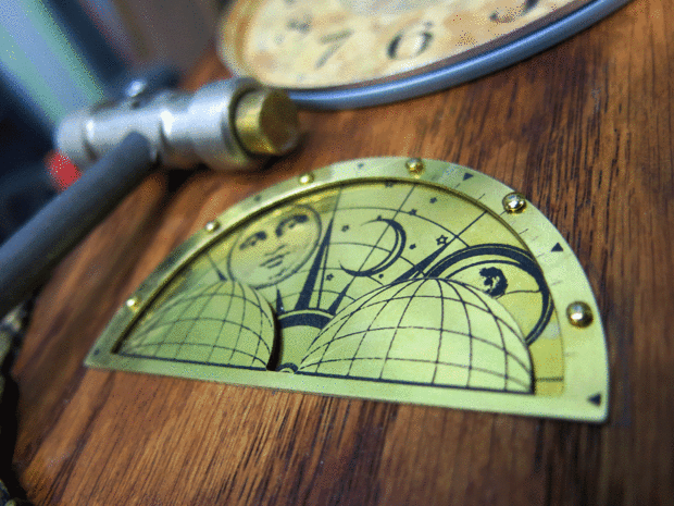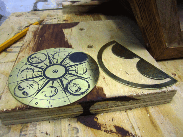 Estaba muy contento con el gráfico de fase lunar que tina hecha en Illustrator - nos llevó a una tienda para obtener grabados en latón de la hoja. Lamentablemente tuvimos que cortar el disco de fase lunar por la mitad para que se ajuste; hemos tenido laserjet corte antes teníamos las otras mediciones, por lo que hemos hecho demasiado grande. Tuve que muy cuidadosamente muy pequeños agujeros de taladro en el lugar de la cara - cualquier presión fuerte y el latón se retuerza.