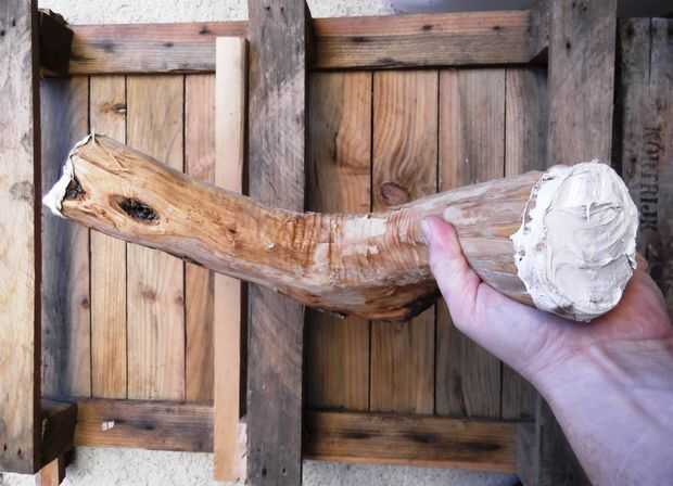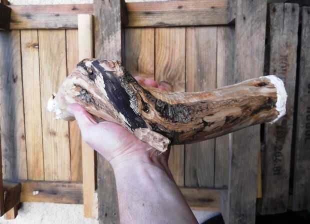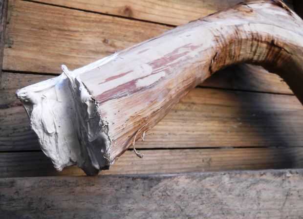Madera fresca no es adecuada para manejar directamente. Tienes que secarlo, por supuesto. Para fijar este proceso generalmente me Pele la corteza con un cuchillo y selle ambos extremos del codo con pegamento del poliuretano. También se puede utilizar cera de vela. Esto evita que la madera de secado demasiado rápido y se agrieta. Darle algún tiempo – un año es perfecto – y guárdelo en un lugar bien ventilado. No poner al sol o sobre un radiador. Cuanto más lento se seca, el mejor.