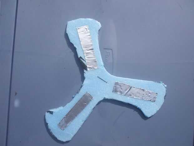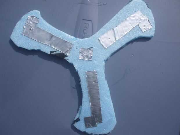 Esto es donde la cinta de aluminio. Poner la cinta cortar la cinta de 2 3/4 pulgadas de largo, luego corté en cuartos. Tomé tres de los cuartos y poner uno en el centro de cada ala. ahora debe tener uno de los cuartos a la izquierda. La cuarta final que corte para arriba en cuatro pequeños cuadrados. Coloqué los cuadraditos en el gancho en el extremo del ala y parte de la cinta acaba de poner en. La plazoleta final debe colocarse en el centro de la pieza.