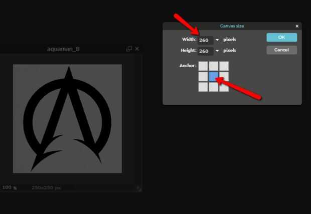 Si desea agregar espacio en blanco alrededor de su imagen, aumentar sólo el tamaño del lienzo por unos píxeles con el centro como su ancla. (esto si tu marca es deformada en los bordes, sabrás lo que me refiero más adelante cuando vayas a hacer la plancha de la marca)