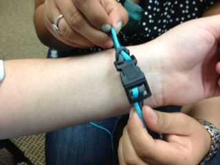 Deslice el otro extremo de su sujetador en el cable, mucho como lo hiciste la primera vez. Clip de juntos y deslícelo sobre la muñeca. Esto le permitirá a la medida de la pulsera para sus necesidades. Recuerde que una vez que comienza la trama de la escalera espesará hasta un poco.
