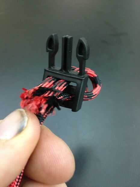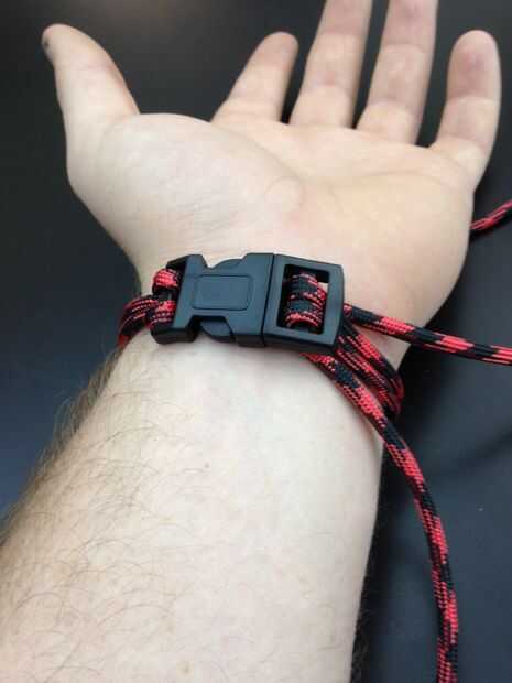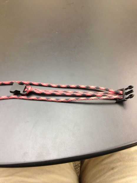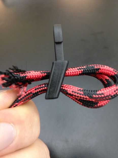 Tomar el extremo macho hacia usted y alimentar las colas a través de la ranura inferior y luego hacia atrás a través de la ranura superior. Ajuste la longitud alrededor de la muñeca según sea necesario. Pone sus cuerdas plana con las colas en el exterior.