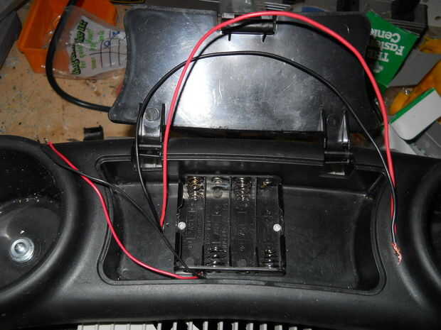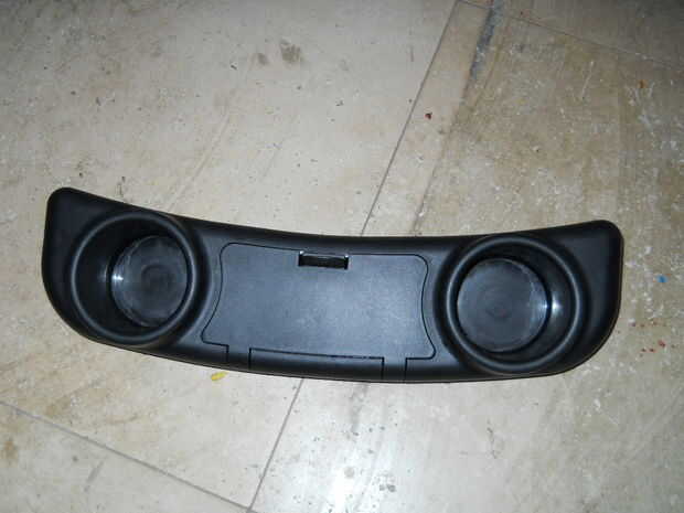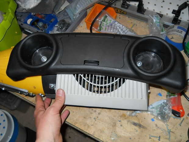 El culpholder plástico de la silla de paseo tiene dos funciones: soporte de bebidas y caja para el soporte de baterías. Fija al brazo cyborg y me había instalado al soporte de las baterías dentro de la caja de apoyavasos.
