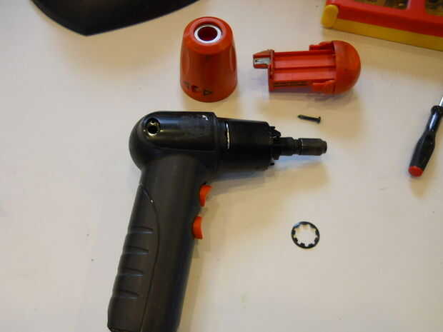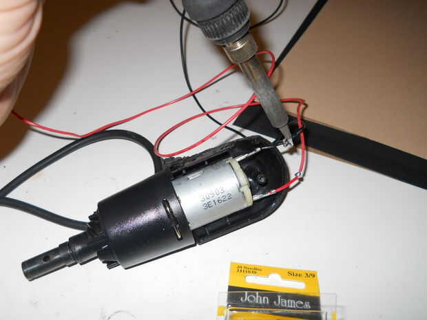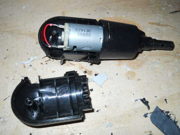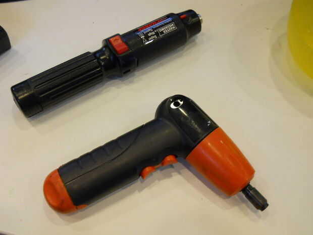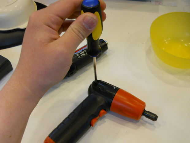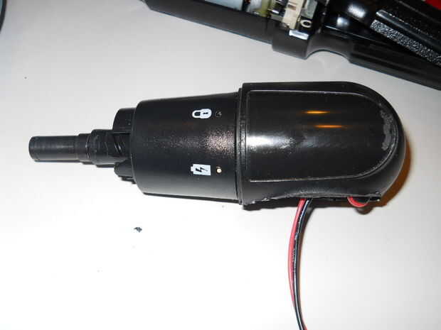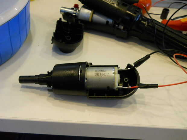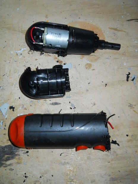 Tomé un destornillador eléctrico Black & Decker y lo corté en dos partes separadas: la caja de engranajes (para la pinza de apertura y cierre de movimiento) y la manija (para grabing el cyborg del brazo y activar la caja de engranajes).
