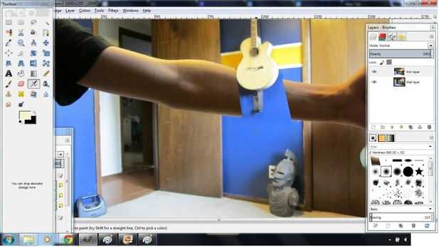 Eliminar algunos de tu brazo (o lo que haces) y asegúrese de que el aspecto de la iluminación correcta, parecerá muy extraño de tiene una caja de pared de color más oscuro en medio de la imagen. Tuve que usar el aerógrafo y cubo herramientas de relleno para conseguir minas para lucir bien.