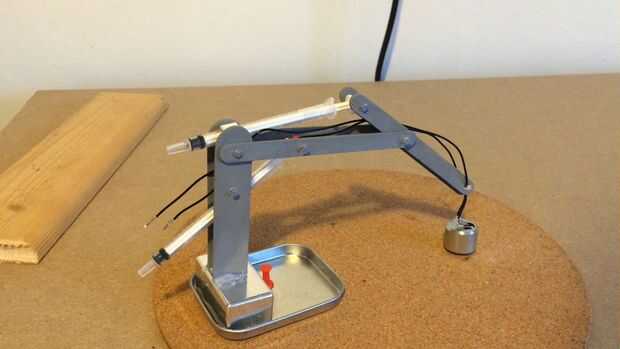 Simplemente, os adjunto el brazo para la base giratoria usando pegamento caliente. Utilicé una tapa cuadrada para después de afeitar para dar el brazo de cierta altura para permitir que la tubería hidráulica caber detrás del brazo. Para el dispositivo de elevación pensé que sería cool agregar un electro imán, así que compré uno de la tienda de electrónica local. Yo siempre puede hacer un DIY electro imán por enrollar un cable alrededor de un tornillo de metal. He roscado el imán en el extremo del brazo y metidos los cables hacia la parte posterior como se muestra.