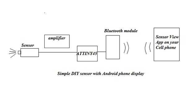 La figura 2 muestra el diagrama básico del dispositivo sensor construí. Es muy simple, en el caso de un sunphotometer, simplemente puede usar un LED para detectar la luz del sol, que generará alrededor de 1 V al Attiny45. La señal de voltaje es proporcional a la intensidad de la luz del sol y se convierte en un número digital por el convertidor ADC dentro el Attiny45. El número digital entonces es enviado a través de Tx para el módulo de Bluetooth. El Bluetooth se conecta con mi teléfono Android y la aplicación "Vista del Sensor" (disponible en https://play.google.com/store/apps/details?id=com.chavatech.chavasensor) toma los datos, convierte a cantidad física utilizando una ecuación de calibración. A continuación muestra la medición en la pantalla del teléfono móvil dinámicamente. En mi caso, aún no tenía que utilizar cualquier amplificador pero que sin duda es una opción para detectores débiles antes de enviar la señal al Attiny45.