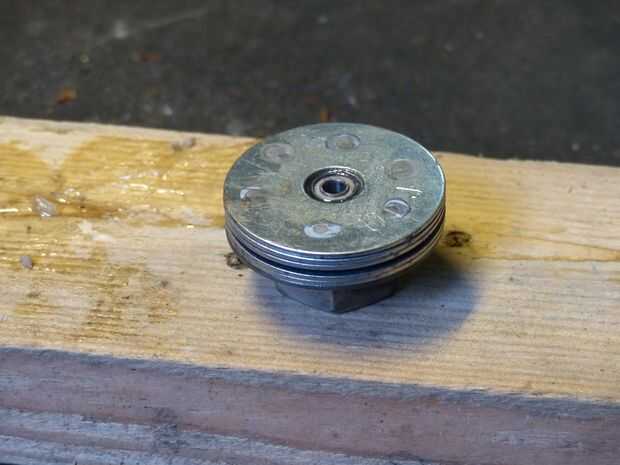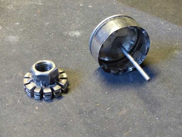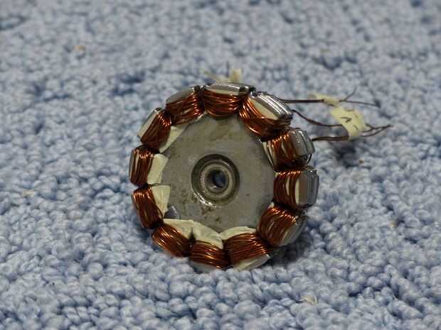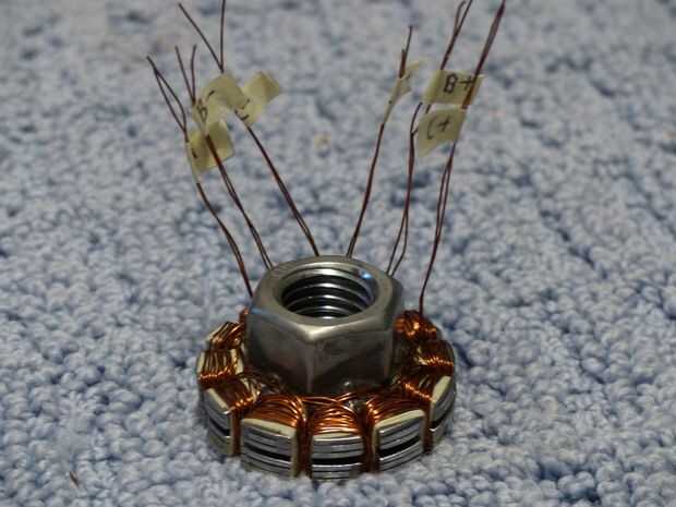 Los imanes permanentes son norte sur norte sur cada otro imán alrededor de todo el camino. La campana de de que montaje de los imanes dentro una pieza se corta de una lata de pintura vacía. Las bobinas son en 3 sets (A, B y C) como antes, pero todas las bobinas se hieren la misma dirección en esta ocasión (todo hacia la derecha). Así que la orden de liquidación es A + B + C + A + B + C +... de todas las 12 bobinas. El núcleo que enrollé las bobinas sobre hace de un apilado de las arandelas de defensa ajustaron juntos. Existen rodamientos de bolas en el centro de las arandelas para girar en el eje. Soldar una tuerca grande hexagonal en una de las arandelas para dar un marco de buen montaje al motor (por lo que puede sujetar a algo). La tuerca hexagonal facilita la posición de los 12 cortes que debían realizarse en las arandelas para formar los núcleos individuales para las bobinas de la globo ocular.