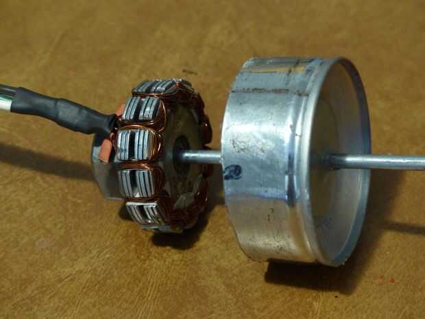 Después de hacer el plástico que se muestra en el video, hice un motor outrunner de construcción de acero. El diseño de outrunner tiene el estator con las bobinas en el centro y una campana del rotor alrededor de eso con los imanes en el interior superficie del rotor. Este particular utiliza bobinas de 12 y 16 imanes permanentes en un anillo alrededor de las bobinas.