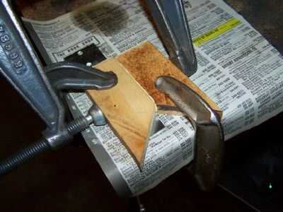 Abrazadera los trozos de madera a una superficie plana. Un pedazo de papel de periódico o el libro de teléfono mantiene el pegamento se adhiera a la superficie plana. Coloqué el pedazo plano de acero debajo de una de las piezas de madera antes de sujeción para levantar por lo que sería un borde levantado en la Unión que podría utilizar para alinear la pieza de acero cuando se fije a la madera. El borde del acero tendrá que atraviesan exactamente el ángulo formado por las dos piezas de madera. El pegamento es de la línea que biseca el ángulo. Mientras que el pegamento no está todavía templado raspe el exceso de pegamento con un cincel el borde levantado es limpias y afiladas.