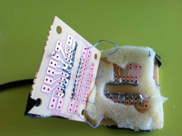 Aquí es el extremo sí mismo. Tomé dos PCB y cayó un montón de soldadura todo ellos. Así, cuando se tocan entre sí, completan el circuito. Probablemente podría pensar una mejor manera de hacerlo! Deben conectar los dos cables del paso anterior a cada lado. Les de no tocar con un donut de espuma. Arrancaron mi espuma de un viejo cojín de Dance Dance Revolution.