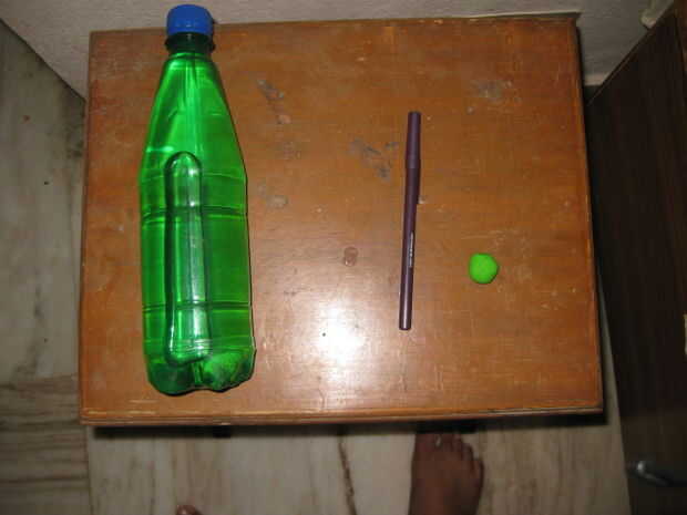 conseguir una botella con agua justo debajo de la llanta, una pluma y alguna arcilla