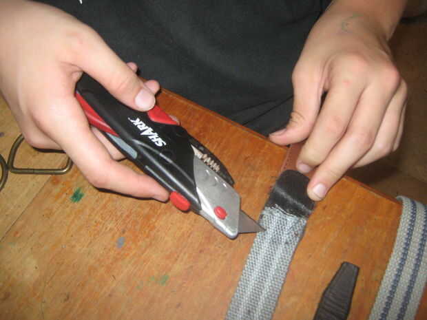 En primer lugar el agujero-correa de cuero de la correa va a ser en la manera entonces retirar cortando los hilos con un cuchillo.