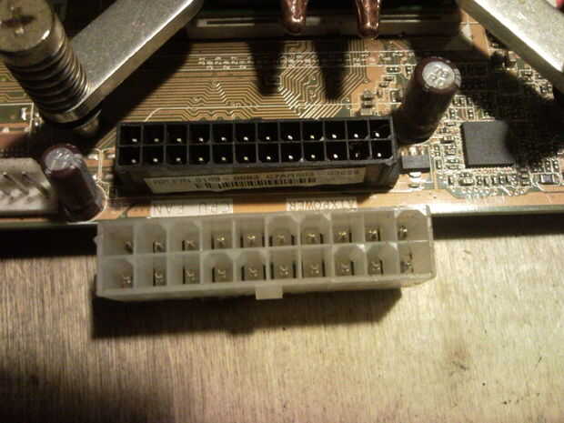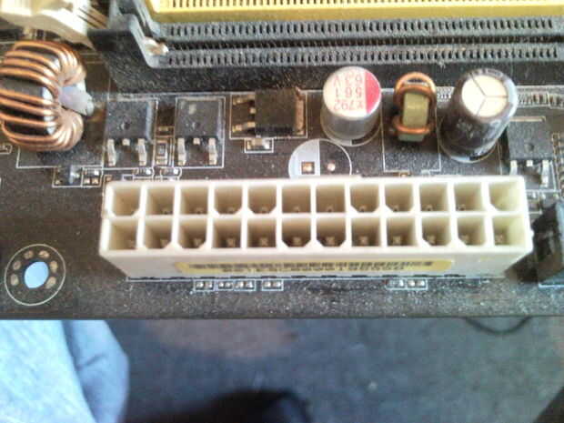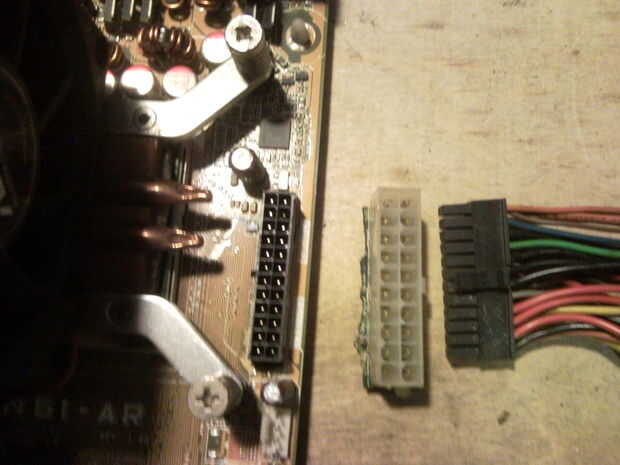 Foto #2 que te darás cuenta si cuenta los pines en el conector hembra la placa base tiene todos los 24 pines y el conector rescatado no.