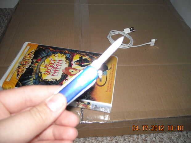 En primer lugar, usted necesita cortar un agujero para el cable en. Para hacer esto, encontré el centro de la caja, mueve mi cuchillo a lo largo de la línea de centro hasta el borde de la caja y había pegado el cuchillo en la caja. Entonces yo lentamente movió para que sea lo suficientemente grande para el lado del USB para caber a través de un lado a otro.
