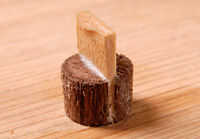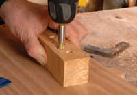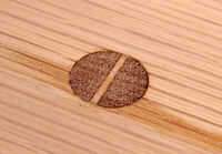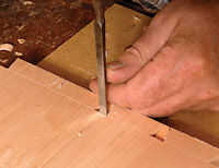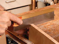 Marque las colas a los lados primero. Para los dientes frontales, la profundidad de la cola debe ser marcado en los lados y los extremos de la placa frontal. Hacer esto con un solo ajuste de su marca o calibre de corte, Foto 3. El gramil al espesor de la parte posteriora y los lados y marcar las caras traseras de estos componentes y el interior cara del frente, para definir la base de las articulaciones. Para un buen equilibrio, las posiciones de cola de Milano se pueden marcar para arriba en los laterales en pares, Foto 4. Marcar los dientes de estas posiciones con un bisel deslizante. Las colas se cortan con una sierra de mano, Foto 5 y picadas hacia fuera con un cincel, un trabajo bastante rápido, Foto 6.