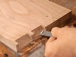 Se puede acelerar mediante el uso de un router para eliminar la mayor parte de los residuos, pero es muy fácil cometer un error costoso, especialmente cuando usted está cortando a mano alzada. En este caso, un poco de trabajo hecho a mano dura es buena terapia. Aplicar el mismo proceso para los dientes en la parte trasera. Como son a través de colas de Milano y en una madera más fácil, se trata de un trabajo mucho más rápido para llevar a cabo.