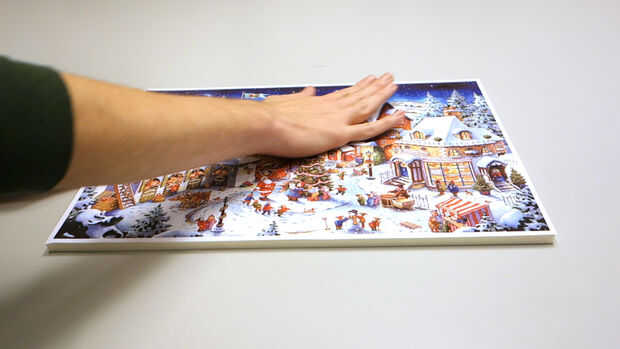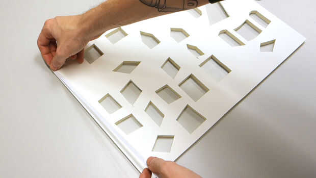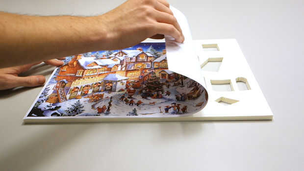 Cuando todos los agujeros se han reducido algunos doble cinta adhesiva echada a un lado del gancho agarrador y trabajar su manera alrededor de la perimiter del calendario. Añadir cinta entre los agujeros para evitar cualquier caramelo se derrame hacia fuera dentro del calendario. Usted realmente no necesita a la cinta hasta el borde del agujero del extremo, pero asegúrese de agregar algunos entre los agujeros para mantener el papel pegado firmemente hasta el cartón pluma.