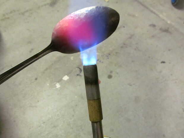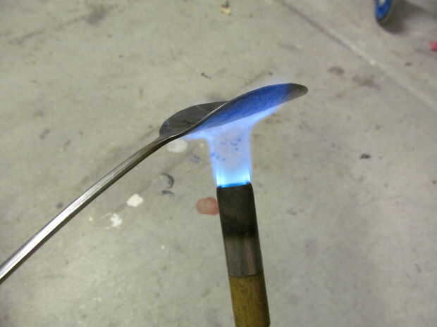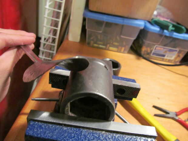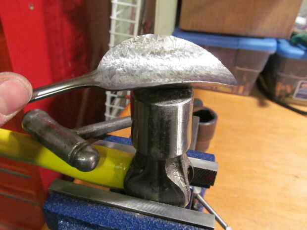 Una vez que la cuchara es curva, Monte un martillo de bola en el vicio y uso final de una Peña de bola pequeños dejar un martillado. Asegúrese de seguir el patrón de martillo que se muestra en el paso uno.