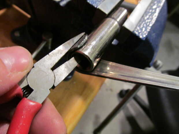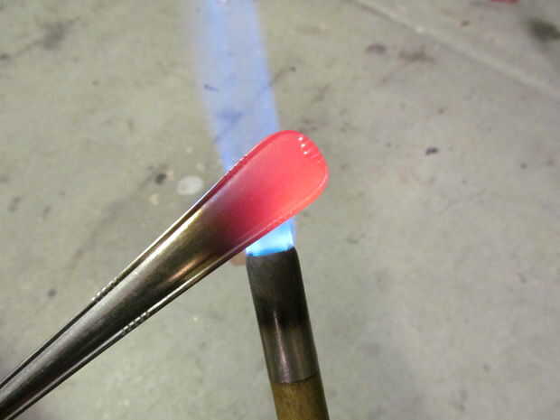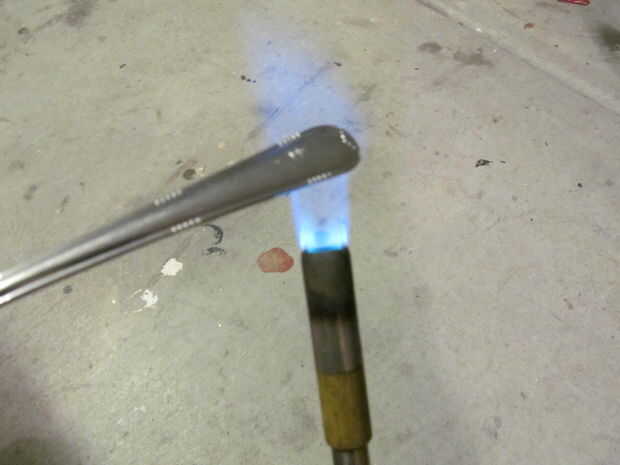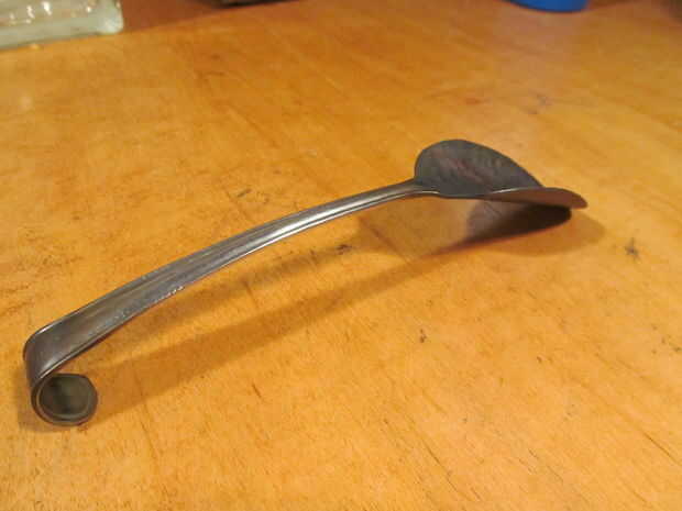 Calentar el mango de la cuchara hasta que está al rojo vivo. Con un par de pinzas, envolver el mango un enchufe más pequeño montado en un vicio.