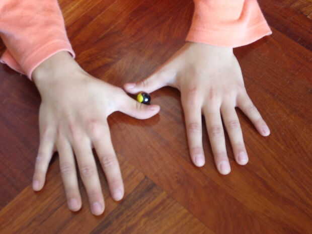 Poner los dedos y el mármol como en la primera foto, con los dedos apenas tocar el mármol. A continuación, mover rápidamente los dedos, como en la segunda foto. El mármol debe girar rápidamente pero no deberá moverse rápidamente. Debería ver su mármol lentamente cambiando de color!