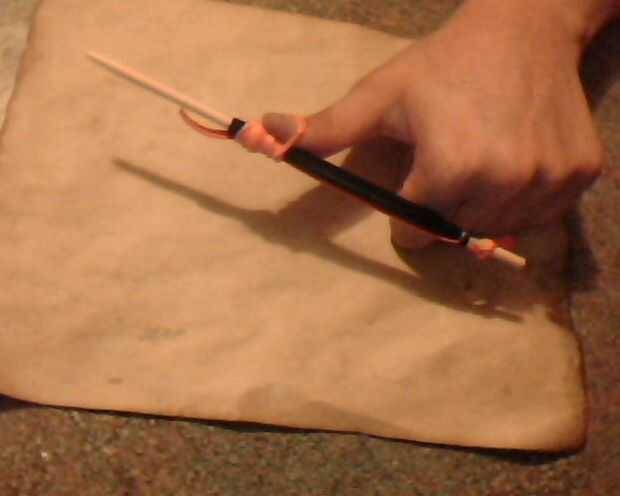 Ahora, agarra tu goma, y aproximadamente 1/4" del extremo del cañón, enróllelo hasta que puede sacar la goma lo suficiente como para obtener el pulgar debajo de él.