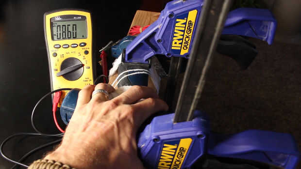 Usé algunas abrazaderas para fijar el dispositivo a un escritorio para aprovechar mejor. Que ponga en cortocircuito los conductores en mi multimetro devolvió un valor de voltios de 5-6 7-8 amperios. Es un generador de manivela de mano accionado de 40 vatios!