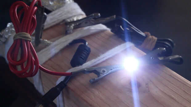 El cargador enciende una bombilla de linterna incandescente, un LED blanco super brillante, y había aún suficiente energía para convertir agua en combustible con el generador oxhídrico en un anterior proyecto!