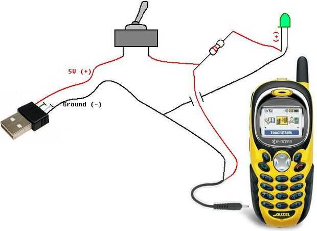 Ahora estoy seguro de que la mayoría de ustedes sabe lo que gusta la lleva en la mirada de los puertos USB, y cómo todo lo que se necesitan son los cables 1 y 4 (rojo, que es su positivo 5V, el negro es la tierra). Basta con cortar los cables blancos y verdes si los tienes, si todo lo que tiene es la parte USB macho metal, entonces solo soldar los cables a la primera y última conduce. Ahora Conecte el cable positivo (negativo también funcionará) a su interruptor de encendido. Luego desde el otro cable en el otro extremo del interruptor, conectar un extremo de la resistencia de 220 (una resistencia más alta también funcionaría, sólo depende de alta brillante desea que tu luz poder ser). Y de esa conexión entre el cable que viene del interruptor de fin de la resistencia, también ejecutar un cable directamente con el cable positivo (rojo) desde el extremo del corte del cargador (sólo tiene el lado con el adaptador que se conecta a su teléfono, sólo debe tener 2 cables, (+) y (-)).