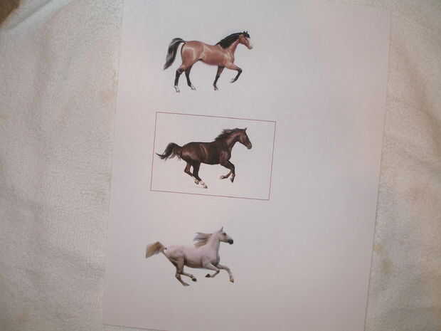 Encontrar algunas fotos de caballos en línea e imprimirlos hacia fuera. Tuve que importar las imágenes que encontré en Adobe Photoshop y reducirlos a 3 pulgadas de alto antes de la impresión. También, graba una pequeña sección de cartón en la parte posterior para añadir cierta rigidez.