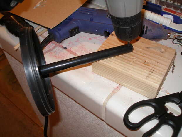 A continuación, perfore cuatro pequeños agujeros en la parte superior de la varilla de carrusel CD, perpendicular entre sí, como los cuatro puntos de una brújula. Estos agujeros sólo deben ser lo suficientemente grandes como para cadena de paso. Usé más guita para que muestran mejor en la foto.