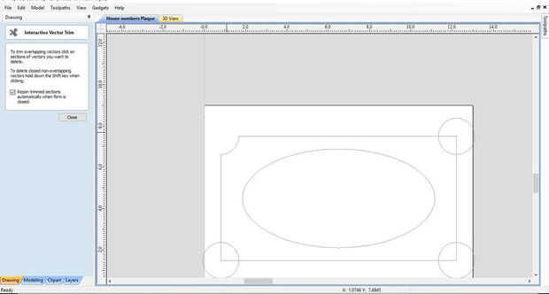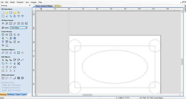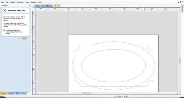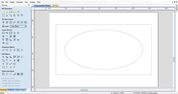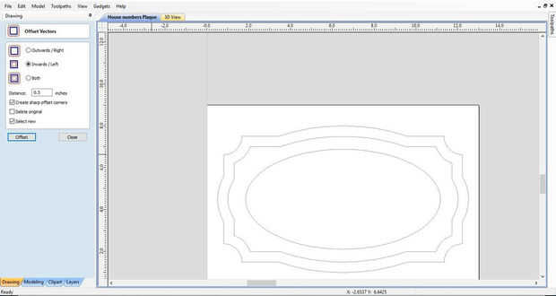 Entonces agregué otra elipse 12 "x 7". Otra vez usé la herramienta para guarnecidos vectoriales interactivos, cortar vectores hasta que tuviera la forma que estaba buscando. Luego puso de relieve el vector externo, seleccionada la herramienta, vectores desplazamiento, hacia el interior. 5" y crea un nuevo vector, que se parece el vector externo.