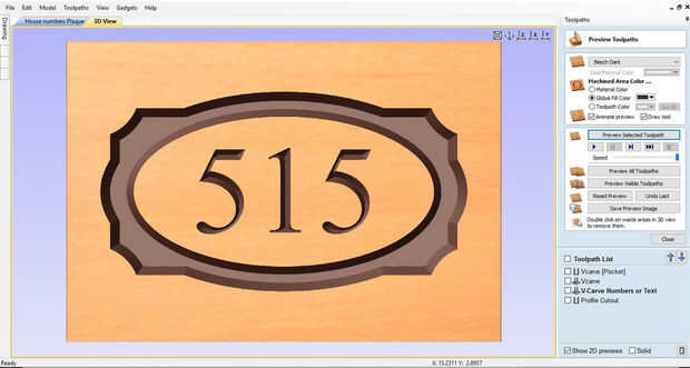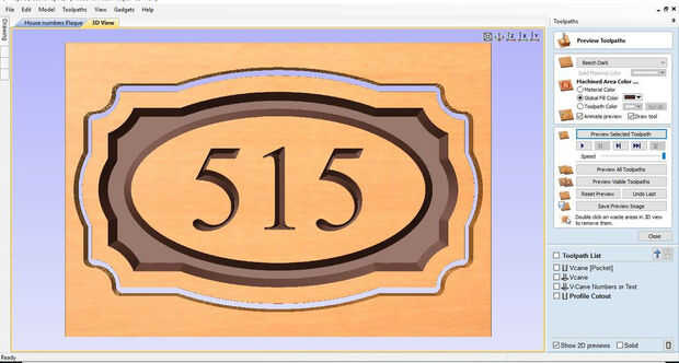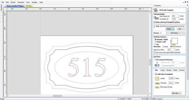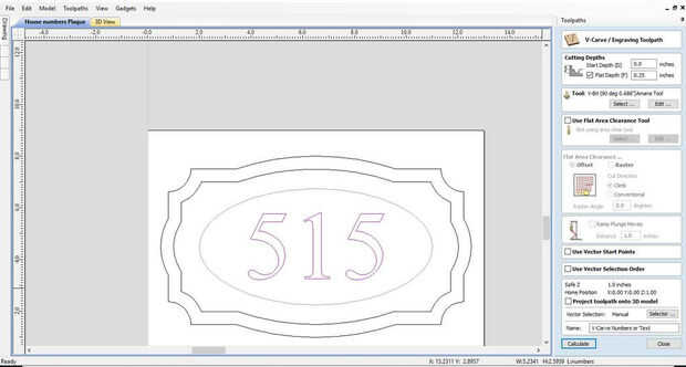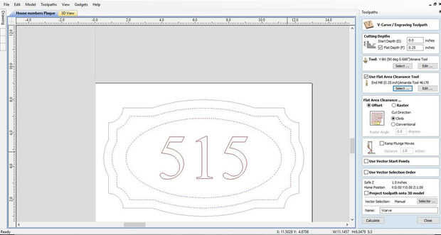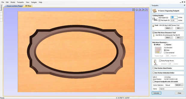 Luego configurar las trayectorias de herramienta, primero usando un downcut fresa de 1/4" bit, para cortar el interiores áreas planas. A continuación, elegir un 90 * V-Bit a terminar los cortes interiores, además de tallar los números. Cortar ambos a una profundidad de 1/4" de grosor.