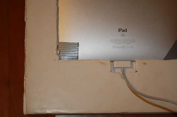 2. Insertar el iPad en una de las juntas y poner cinta adhesiva en ambos lados para sujetar firmemente. El cartel cubrirá la cinta en la frente.