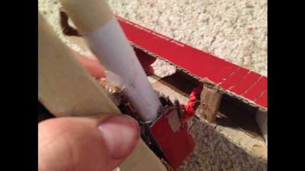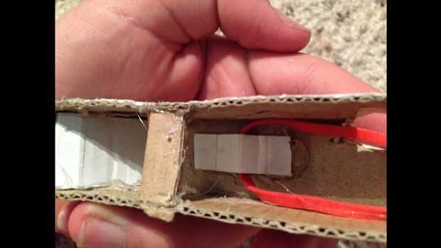 Corte dos ranuras en el lado izquierdo de la ranura falsa eyector para mantener una banda de goma como se ve en la foto. Recortar un clip de cartón y pegamento para sostener el otro extremo de la goma elástica en la parte superior de la diapositiva. A continuación, cortar y pegar un trozo de cartón entre los lados cerca de la parte posterior de la diapositiva. Luego, cortar, doblar y pegar un trozo de cartón por lo que sostiene la pieza entre la diapositiva hacia abajo. Por último, cortar un pedazo de cartulina y pegamento al final de la diapositiva para tapar la parte de atrás. También hacen algunas líneas al final de la diapositiva para emular el agarre, pero asegúrese de no cortar a través de!