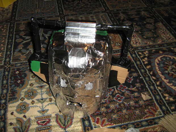 Para hacer los laterales y los tubos en la parte superior, hacer la forma por encima dos veces de cartón y sujete a los lados de la cabeza. Ahora, para hacer el tubo de enrolle un poco de cartón y cubrirlo en cinta negra. finalmente para hacer parecer que se conecta a la cabeza en la parte superior dobla un rectángulo de cartulina sobre el centro y cinta adhesiva en su lugar. (y los lados, cierre de cinta)