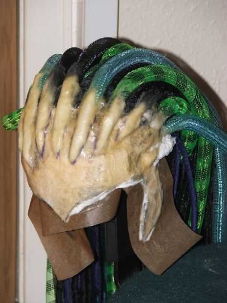 Aquí todas las mezclas de acabado y curadas. He añadido algunos papel encerado detrás de los bordes por lo que puedo añadir finas capas de látex para mezclar a la piel. Otra vez fue un error y se utilizo una gorra calva en el futuro.