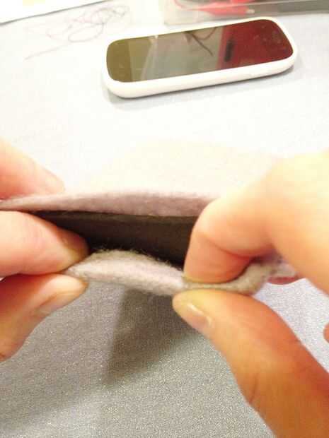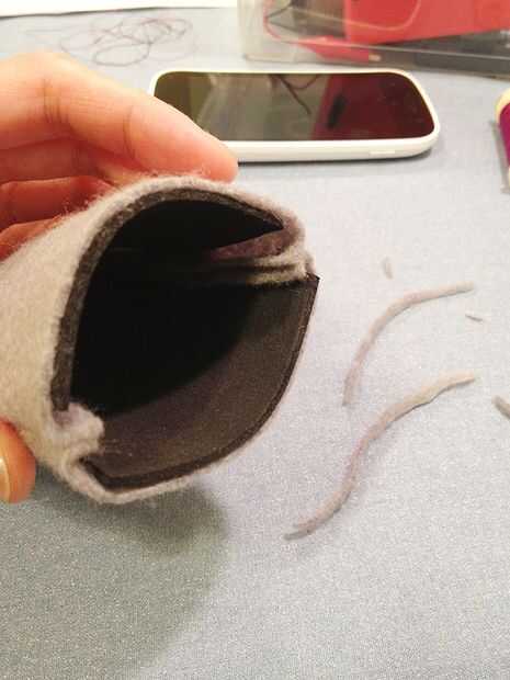 Pero me gustó de esta capas de gris y negro así que terminé tarde el fieltro hacia arriba con la espuma cortando el exceso, entonces la mano cosida con hilo de color púrpura.