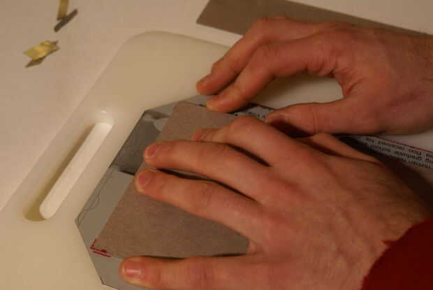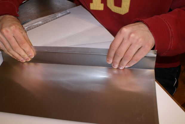 5. a continuación, suavemente aplique presión uniforme y doblar el aluminio en los bordes rayados. Roca la pieza hacia adelante y hacia atrás hasta que se despeguen. Hacer esto para todos los bordes.