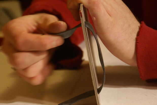6. a continuación, coloque el cartón detrás en el marco de aluminio y tire de la cinta en la ranura de la cartulina. Permite para el labio un poco de la cinta para colocar dentro de la ranura.