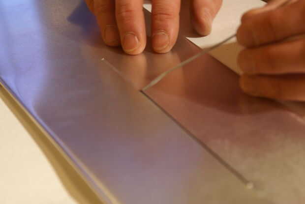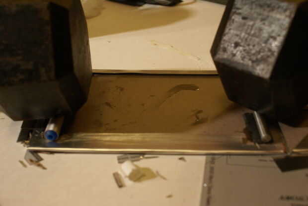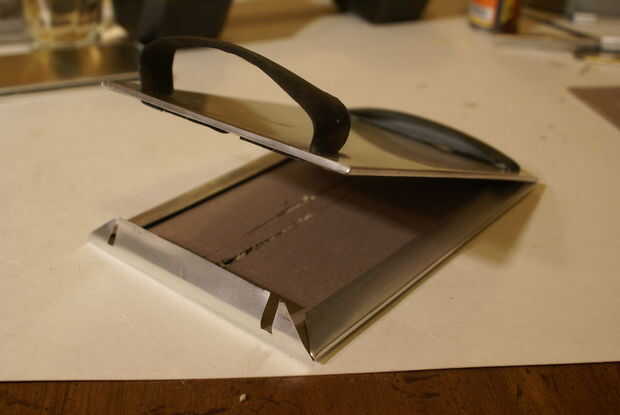 9. ahora dobla el panel al igual que en el primer panel. Utilizando a una guía de palo para doblar el aluminio. Coloque una pequeña cantidad de pegamento del gorila a lo largo de los bordes y coloque un peso en que se seque.