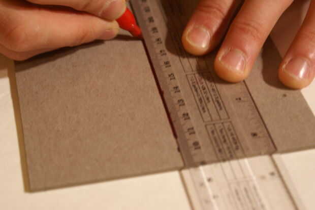 2. Tome el pedazo de cartón que se convierten en la parte posterior del panel y medir un rectángulo que es 1/4" ancho y centrado. La longitud del rectángulo debe dejar unos 3/4 de pulgada en la parte superior e inferior de la cartulina. (para que no corte a través de todo el camino)