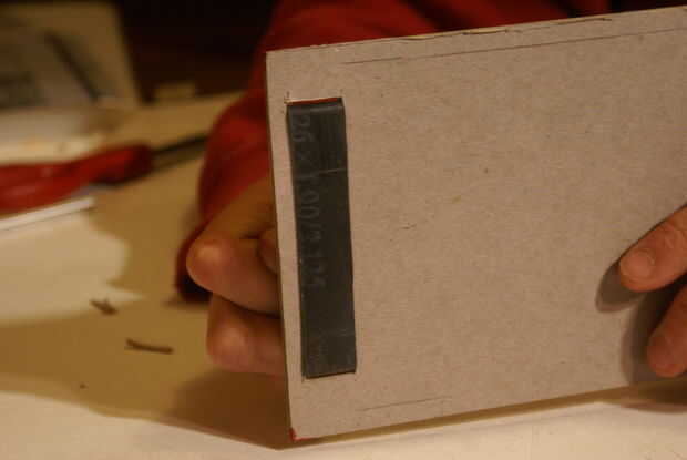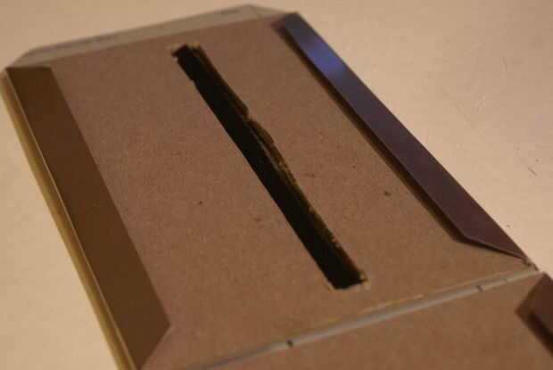4. Tome la parte posterior del panel y cortar una tira de aluminio sólo un poco más que la abertura hecha en el cartón. Asegúrese de que los dos cortes de línea para arriba perfectamente!!
