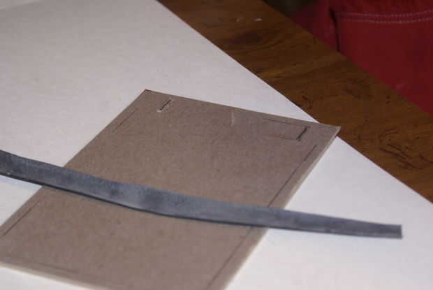 2B. Corte ranuras donde se dibujaron las líneas cortas. Cortar dos tiras de llanta de bicicleta que es aproximadamente dos veces la anchura del kindle. Coloque el cartón detrás en el aluminio y meter las ranuras en el aluminio, así.